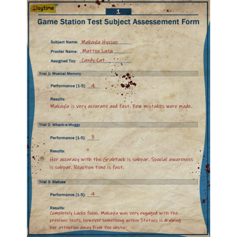 This assessment form is one of the two forms seen regarding the testing of Makayla Hyssop. Within this assessment, it is stated that Makayla performs better than during her last test, however, still lacks focus when playing through Statues. The author, that being Matteo Lata, claims that a similar issue Makayla faced on a prior test featuring Sara Abell also occurred in this test.