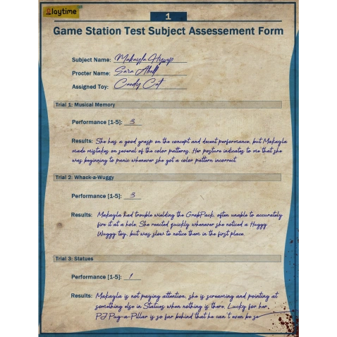 Assessment Form (S. Abell), otherwise misspelled as "Assessement Form" in-game, is a document found within Chapter 2: Fly in a Web of Poppy Playtime.