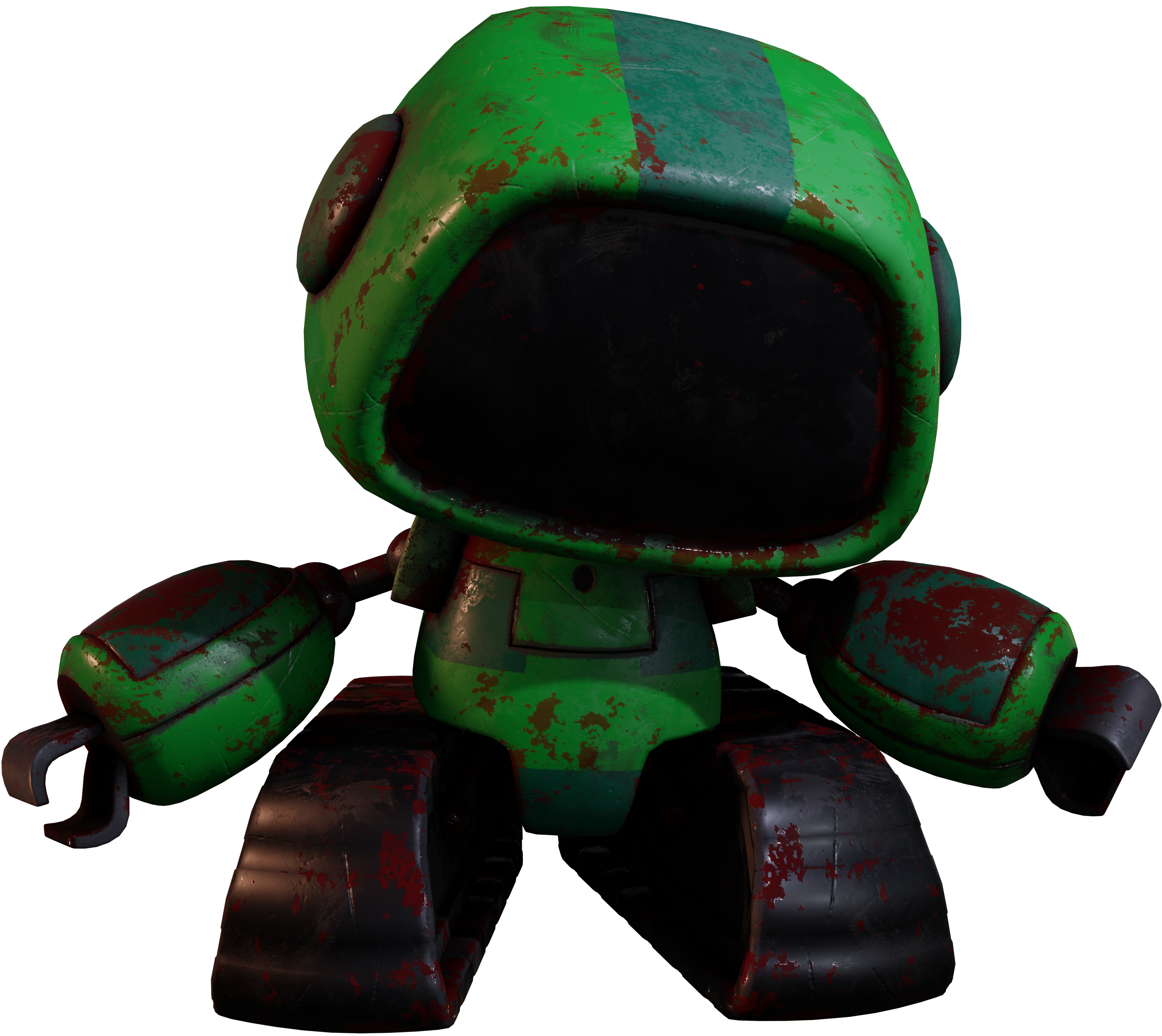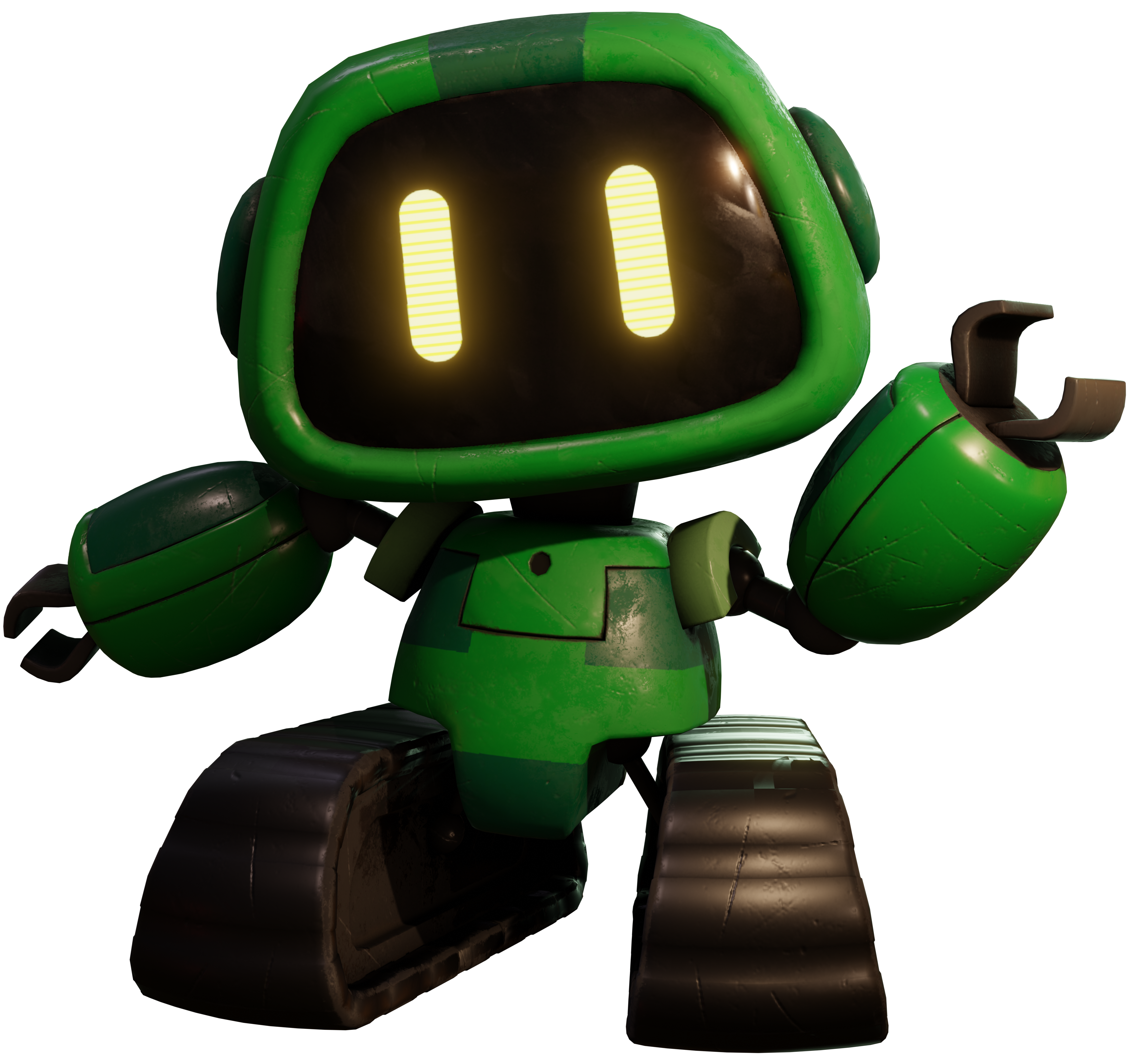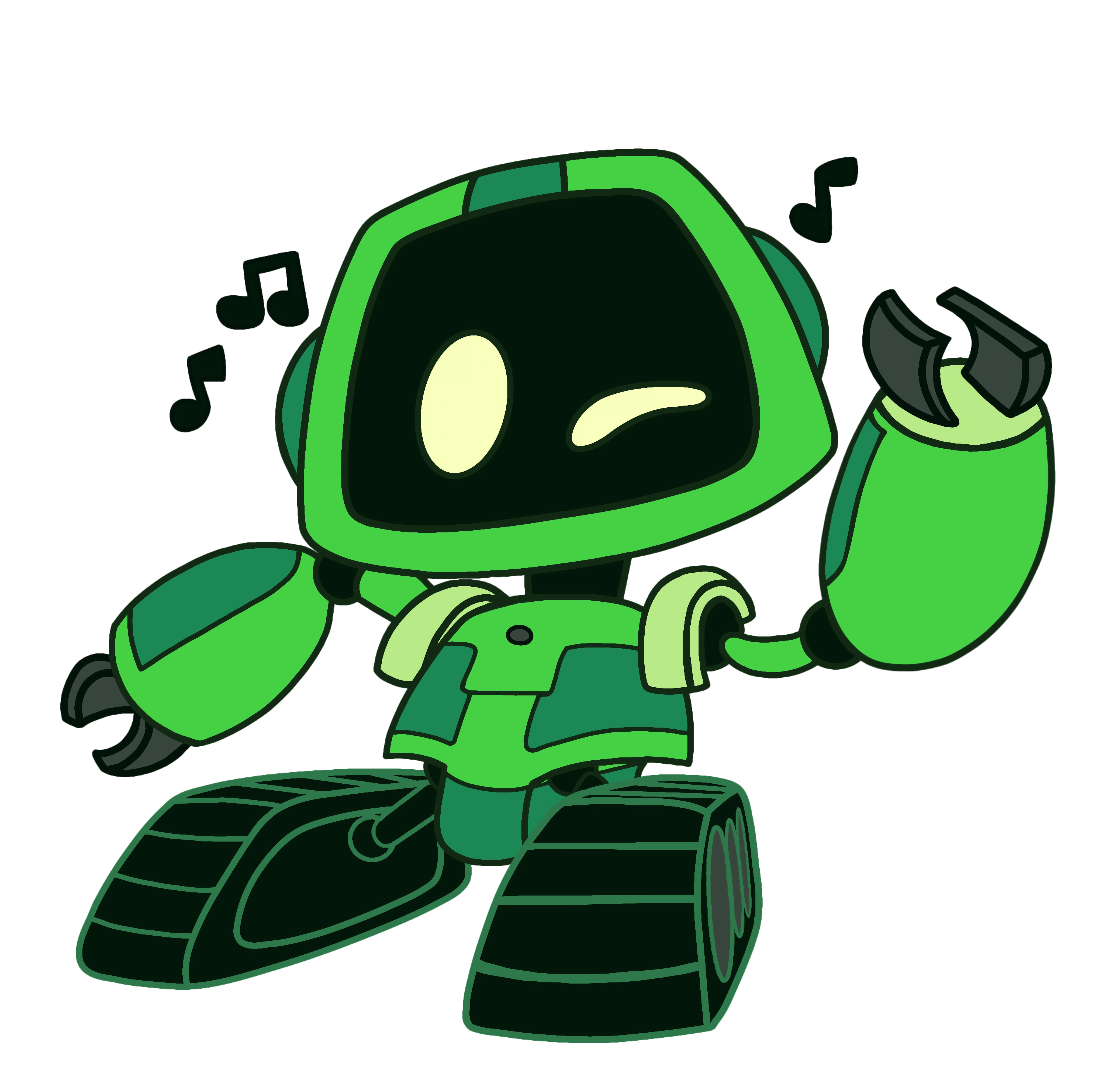 Boogie Bot is a small, battery-operated green robot with a large head. His legs are continuous tracks and robotic claws for fingers. He also has a speaker on his chest instead of a mouth. The limbs are held on by bendable iron wires, and the ears are made in the form of darker circles.