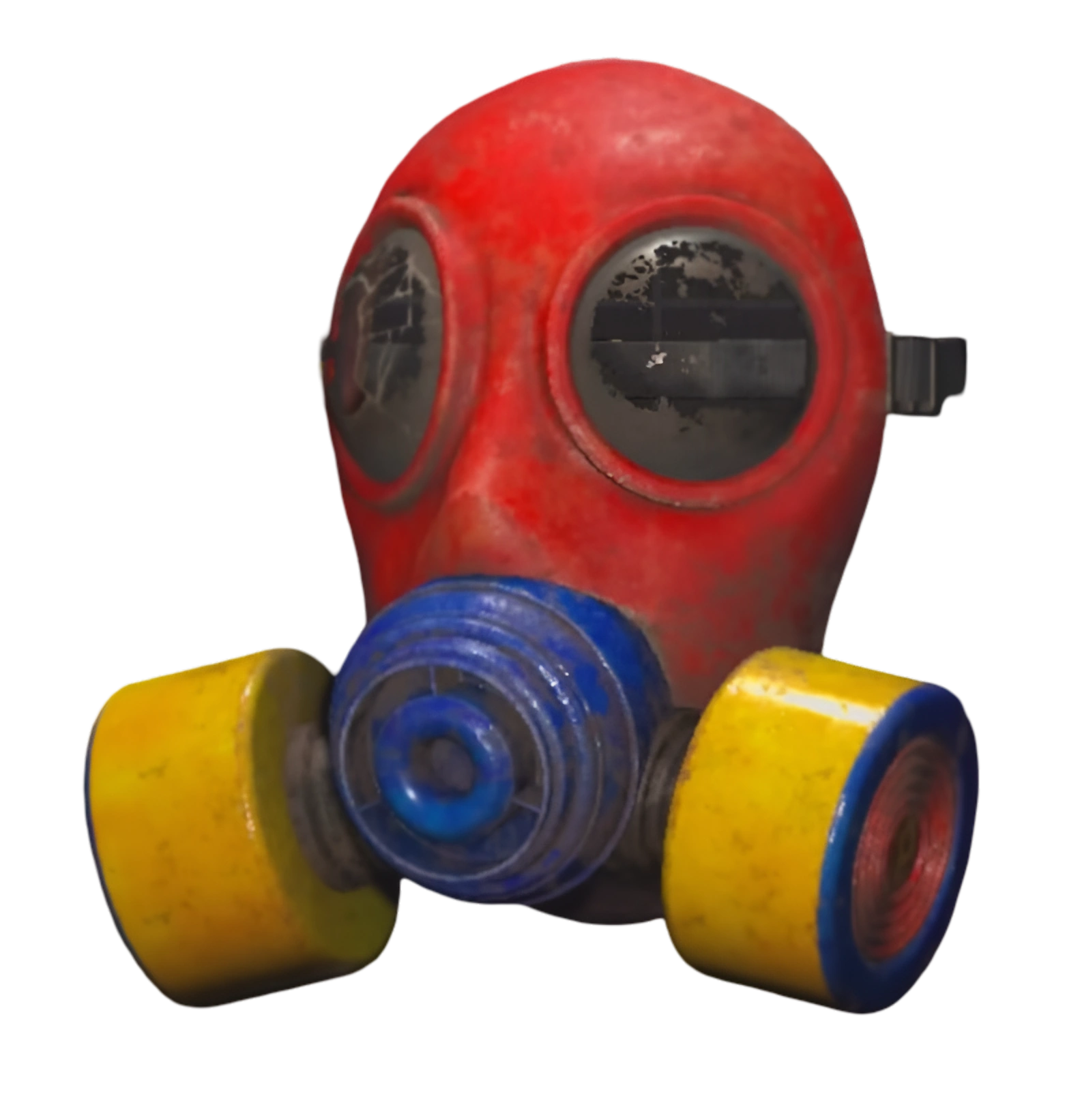 The Broken Gas Mask is an eerie red gas mask with large eye holes shadowed in black. It has two yellow blood-covered air filters, within both of which the Playtime Co. logo can be seen. It has a dark blue exhalation valve and has two straps attached to the back.