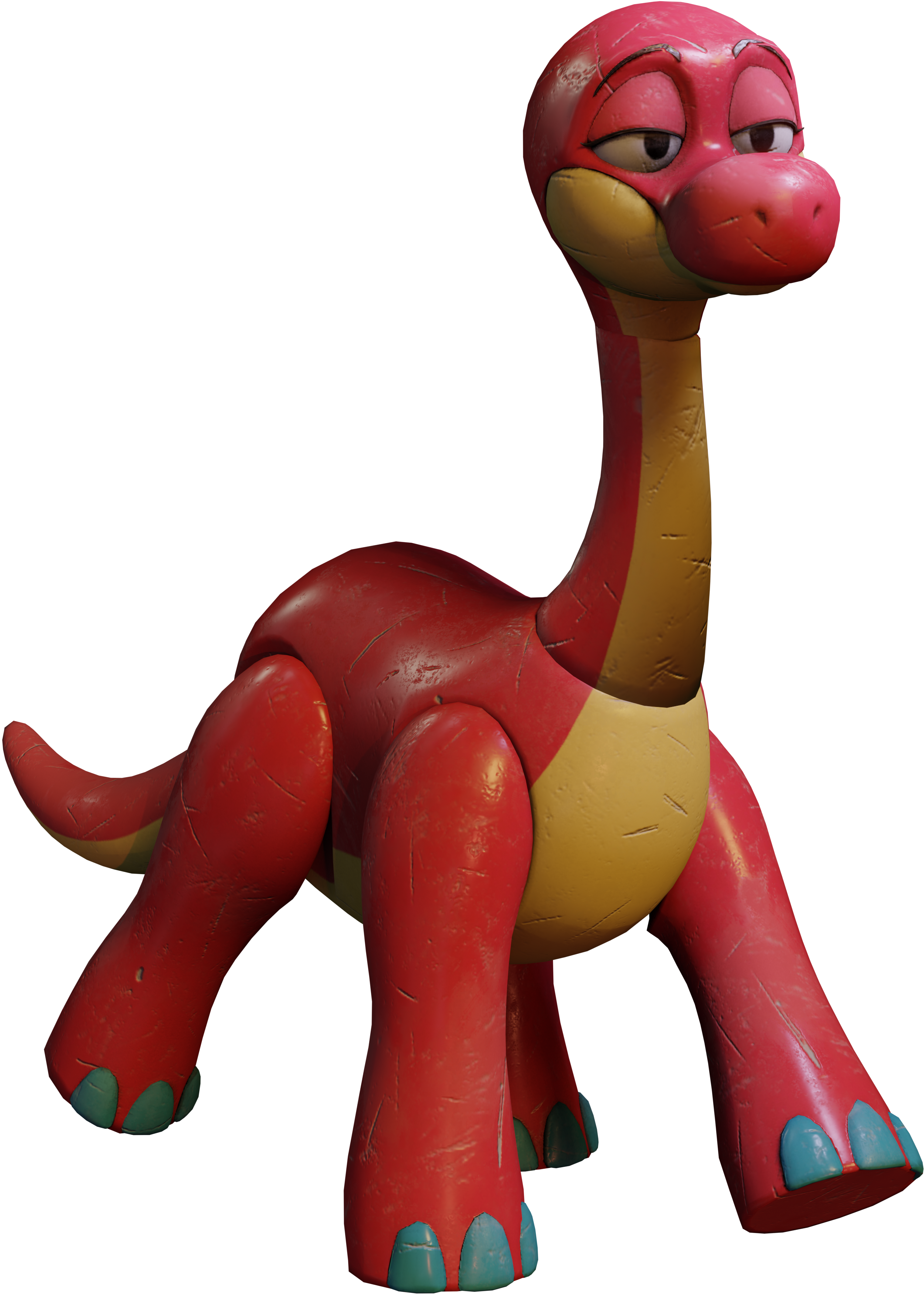 Bron is a large, bright red dinosaur themed after a real-life species Brontosaurus (now extinct). He has a rounded head with a small snout, small black eyes with eyelids, a long neck and four stubby limbs. His cheeks, neck front and underbelly are colored pale yellow to match his brightly colored body.