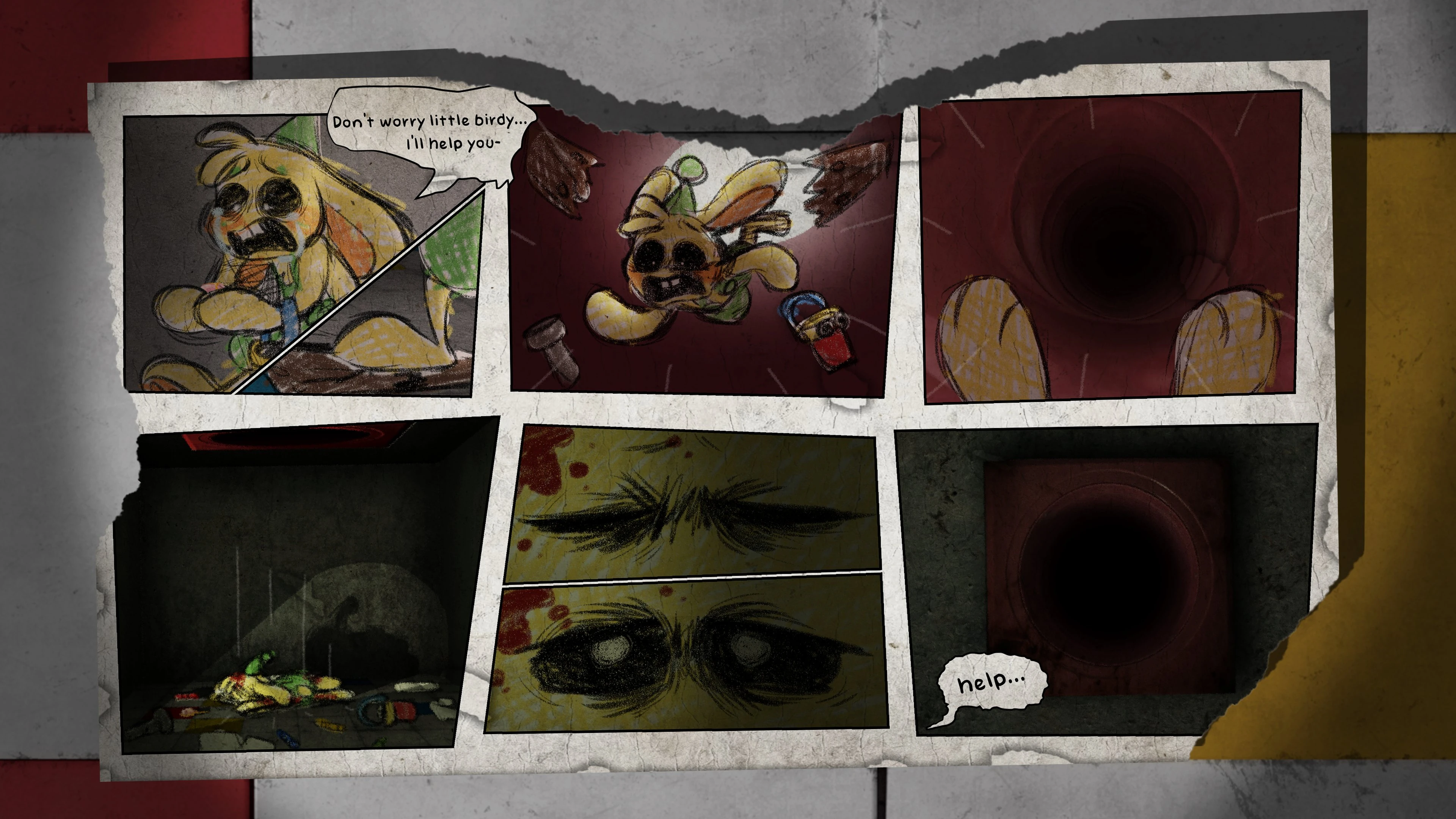 After the community voted for Bunzo to call for help, Bunzo, with all his might, yelled for help to no response. Unable to do anything due to his injured state, he waits an hour, 12 hours, 1 day, 3 days, 8 days, and 15 days with no response while he draws his comics to retell his story of how he got trapped in the pit. Bunzo finally dies while documenting how many days he's on, attempting to write what appears to be 30 days. Bunzo's story ends with a tweet showcasing a render of Bunzo's dead body rotting away. Weirdly, his upper forehead appears to have been bitten out, and he is missing both of his eyes and front teeth. Since there are long scratch marks on the wall near the corpse, it's possible that the Prototype or CatNap took the eyes and teeth. It is unknown if the events portrayed in this comic series are canon.