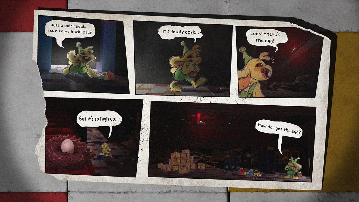 The Bunzo Bunny Easter Comic is a series of illustrated comic panels showcasing Bunzo Bunny as he tries to find the secret eggs hidden around the Playtime Co. factory. The comic was entirely posted on Mob Entertainment's Twitter account, with the community voting on what would happen over time.