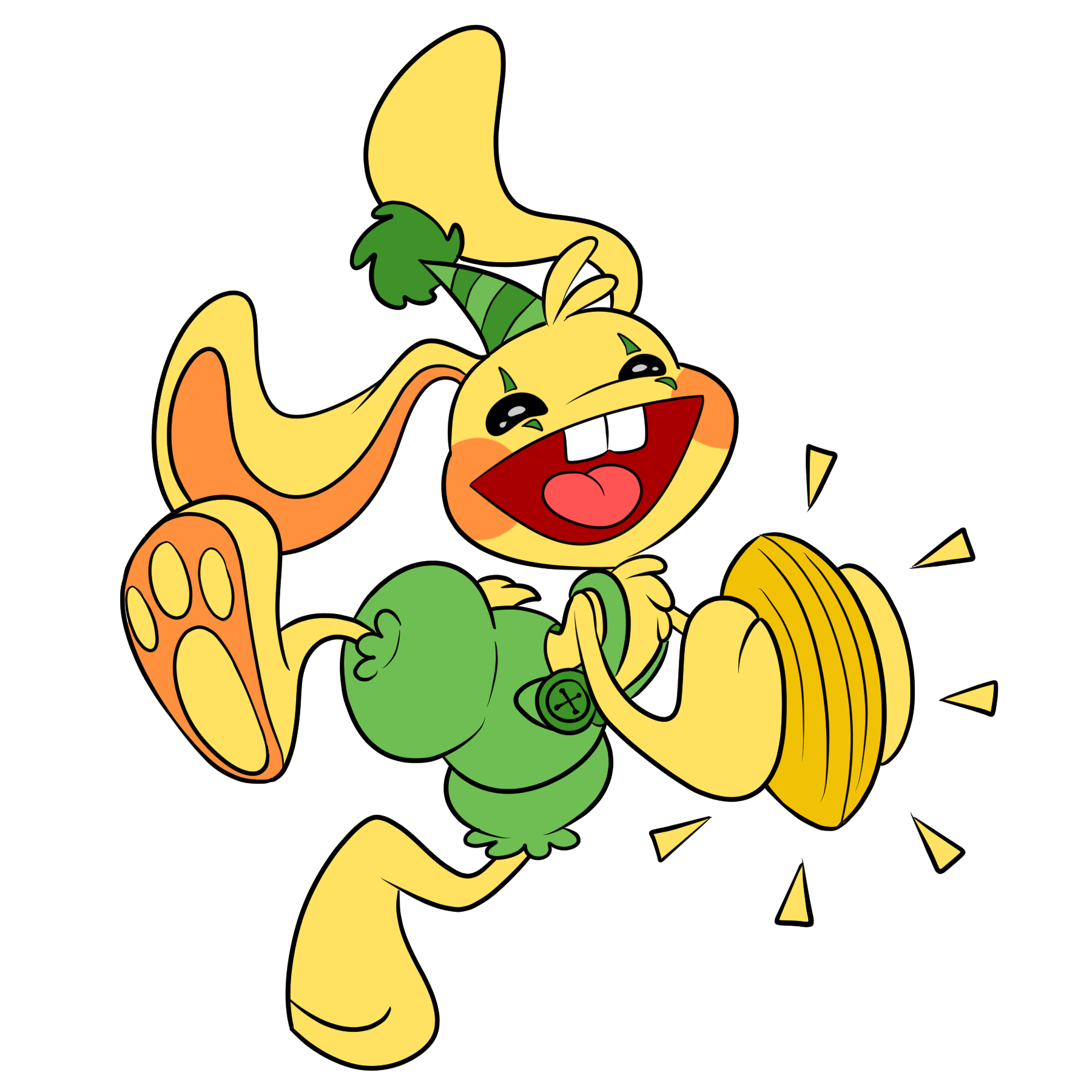 | “ | A yellow rabbit with all the fun and energy a growing kid could require! With his symbols, green overalls, a little green party hat, and button eyes, he’s always ready for a party. | ” |