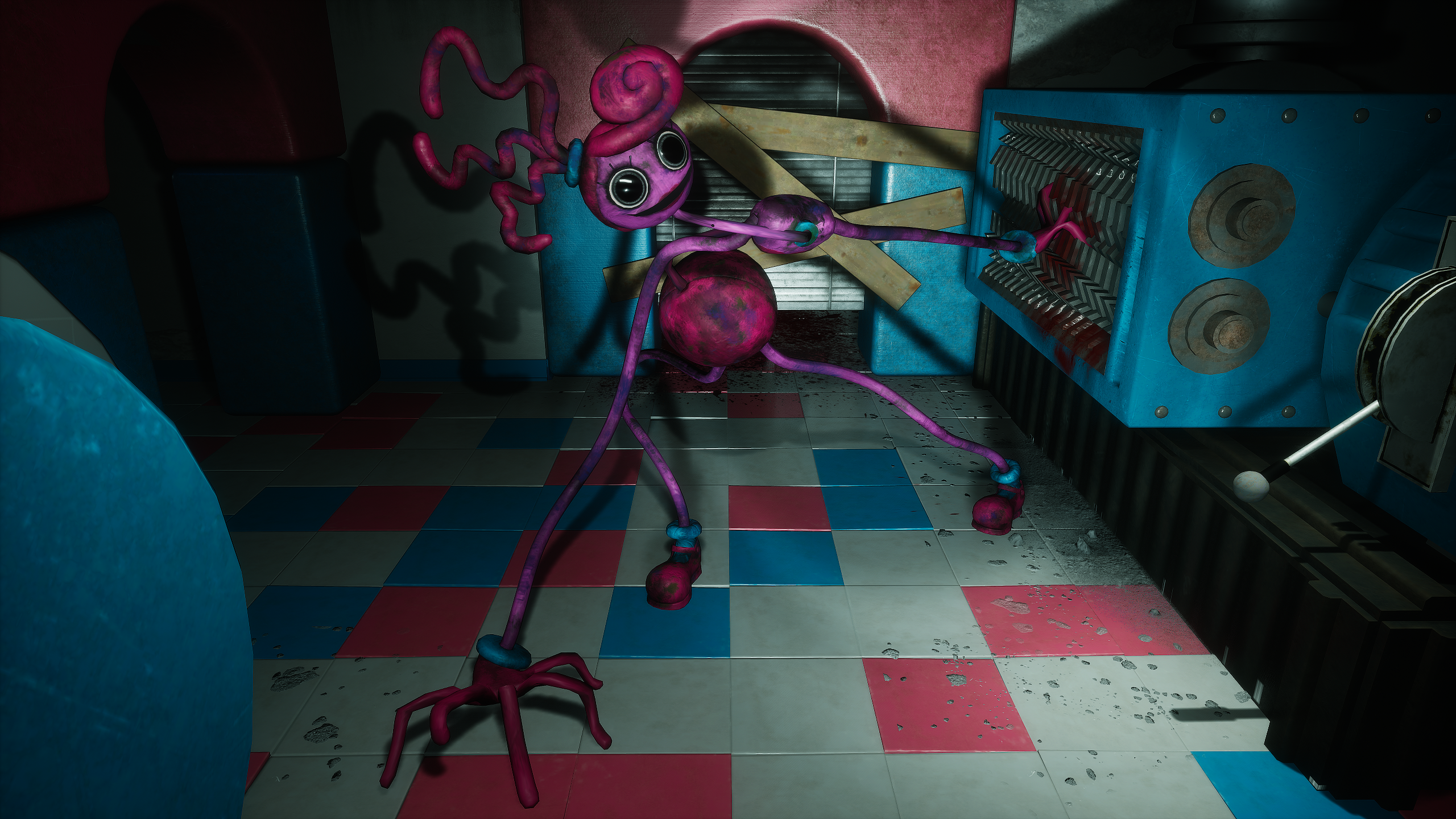 A room with five large closed doors that lead to different areas of the factory such as the Game Station, the Innovation department, the Playplace, the Research department, and the Production department. It is here where Poppy Playtime gets abducted by Mommy Long Legs. To progress, The Player must jump down into the hole in the center of the room. | Mommy Long Legs, Poppy Playtime |