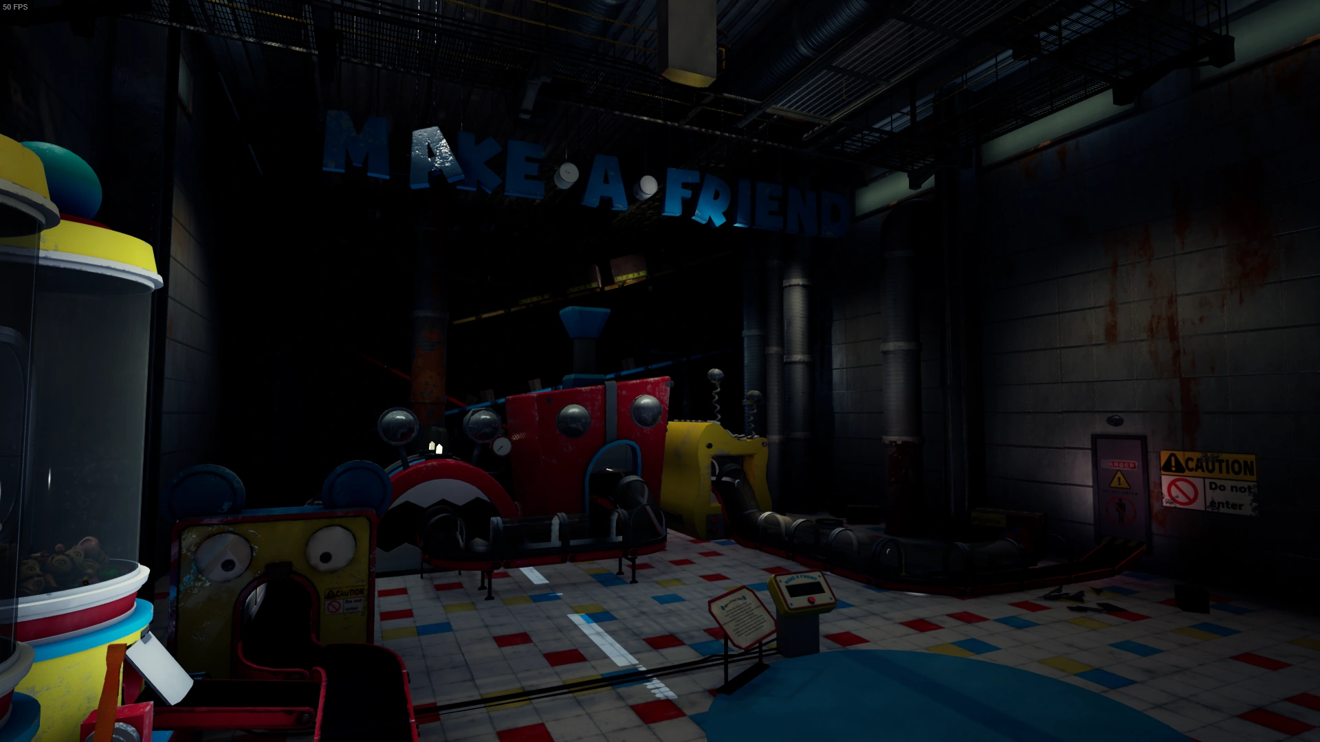 The Make-A-Friend Room contains an old mechanism that was used by Playtime Co. This machine was used for tourists so they could leave with a toy, for remembrance of the facility and also for extra profits, as guests had to pay for it. | Stella Greyber Interview, Cat-Bee Toy, Huggy Wuggy |