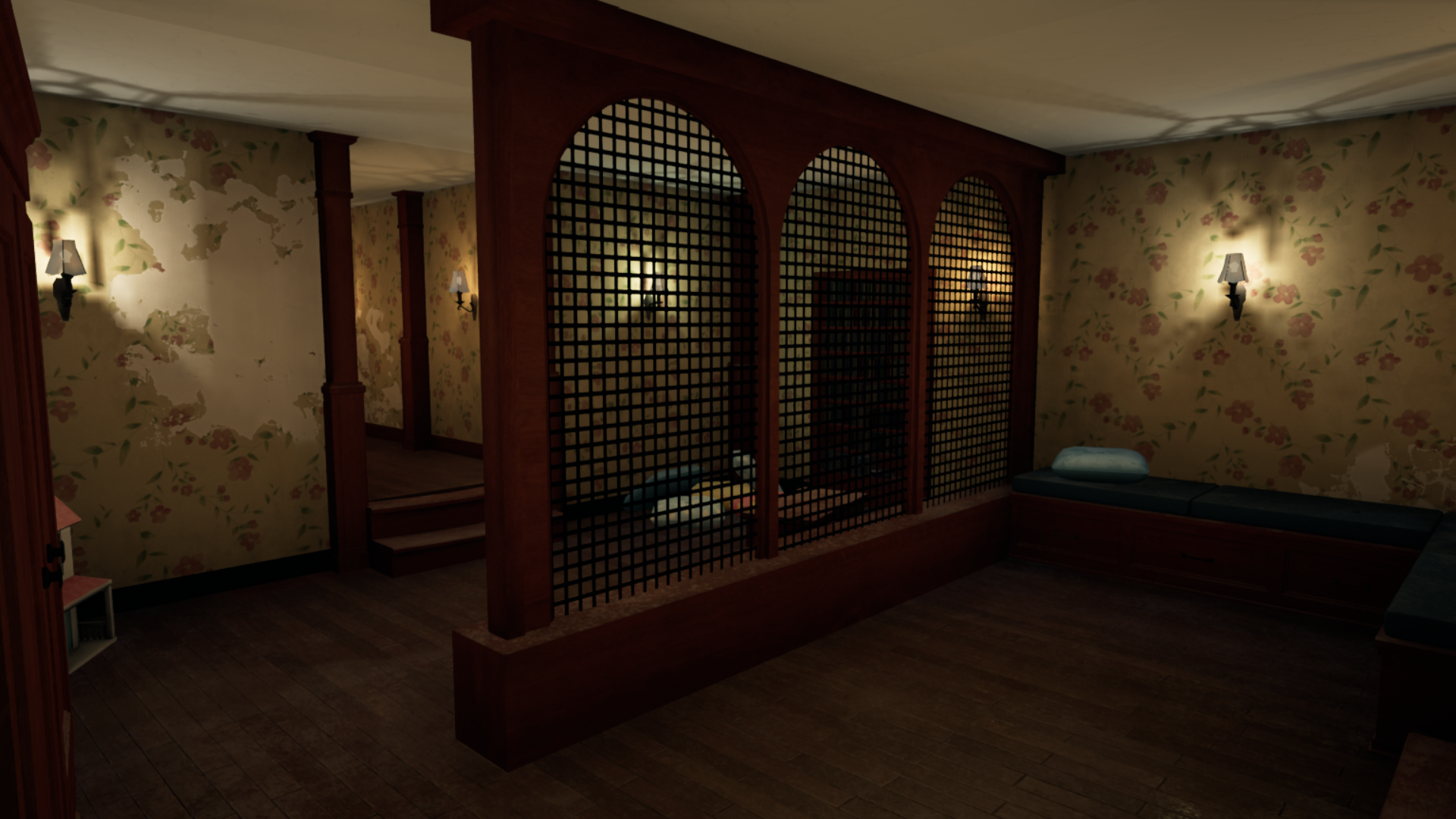 The interior of the Poppy Area is meant to represent a child's room. It has dim, pink lights alongside multiple colorful pillows on the floor. Poppy is initially inside a case in the middle of the room. | Poppy Playtime |