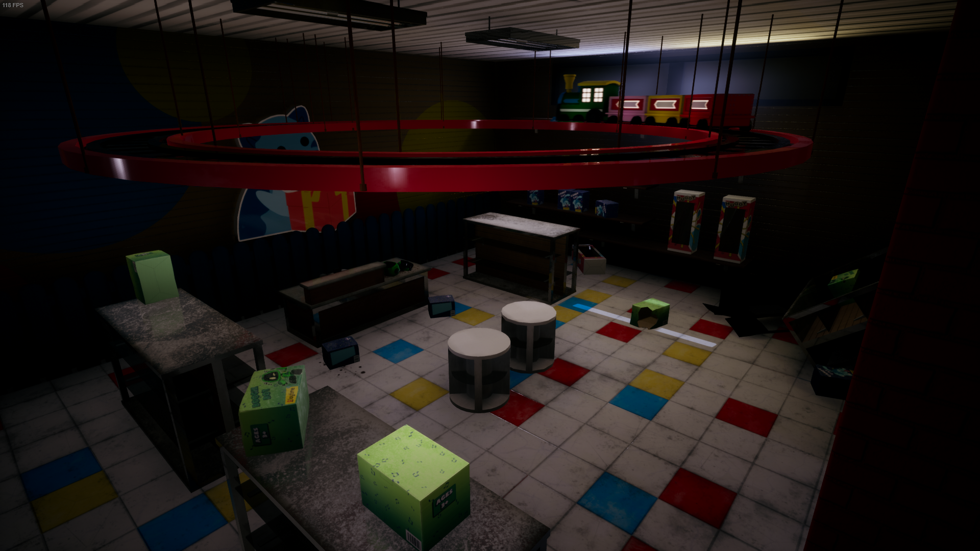 A simple gift shop full of Boogie Bot boxes, Candy Cat boxes, and Huggy Wuggy boxes on shelves. A train is going in circles on the ceiling. This train has the solution for the Security Room code. | None |