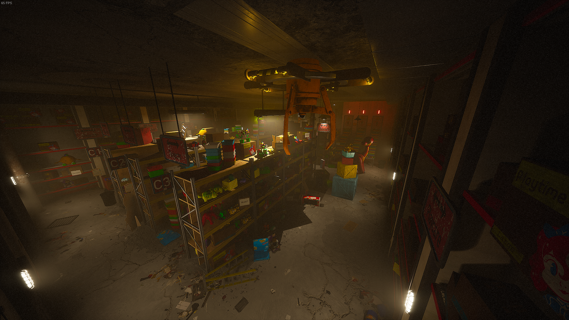A warehouse full of toys, boxes, and the Red GrabPack Hand which must be acquired by collecting the Power Circuits. | Fuses, Red GrabPack Hand, Security Camera: Rich + Avery |