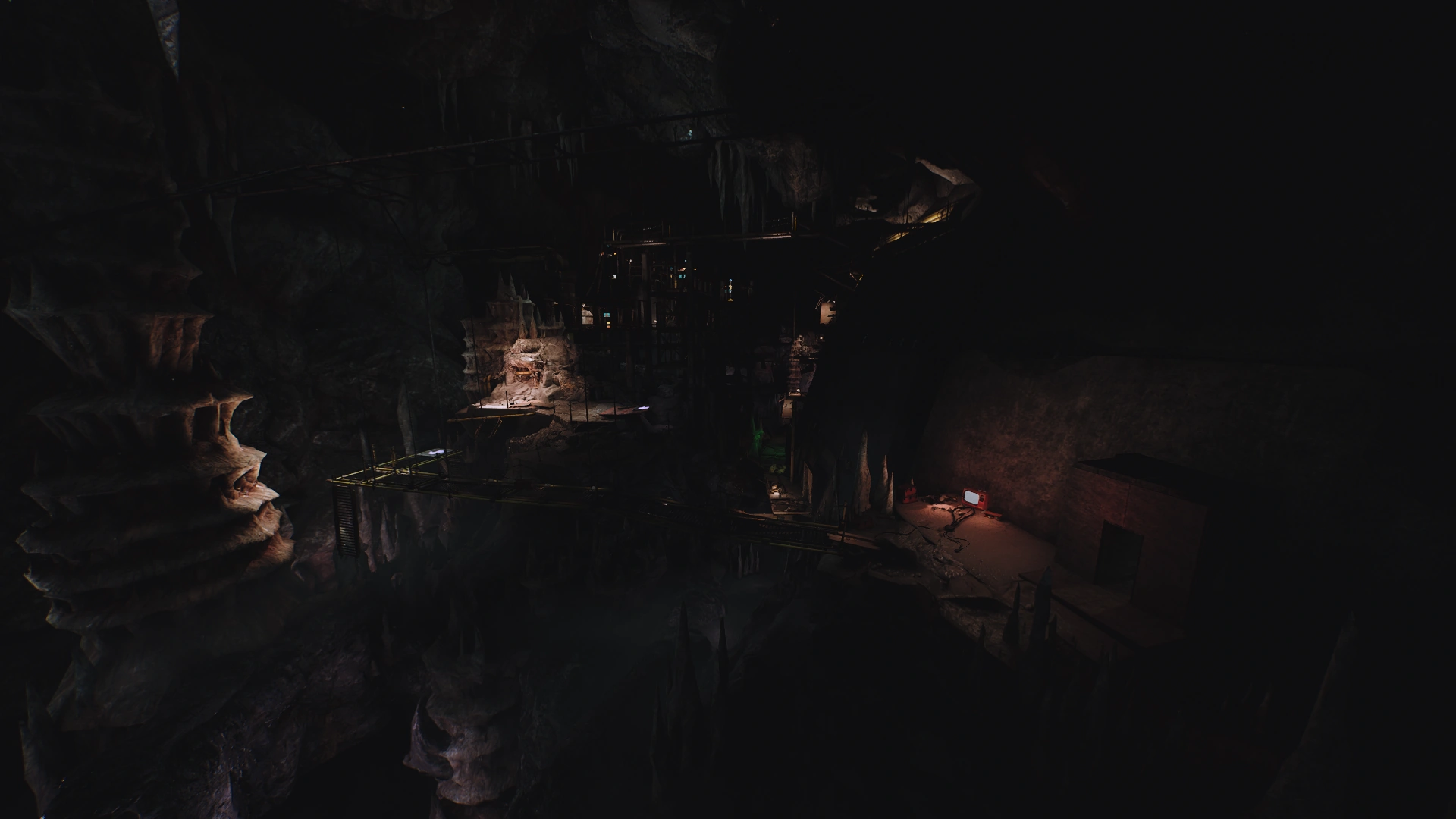 The Caverns is a large underground cave system that takes place outside of the dome of Playcare. There is a bunch of platforms and catwalks connected to each other. Close to the entrance that leads into Playhouse, there is a big shrine that is a mix of toy body's and parts that was created by CatNap to worship his god, The Prototype.