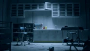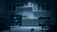 The teaser begins with a long, somewhat dark corridor with several doors on either side, ending with a light shining on a red gate that is probably locked. The scene shifts to inside a room, which contains empty wall cabinets, a sink with a four-door cabinet underneath, another cabinet to the left of the sink, and in front of it a rolling chair beside a small hospital bed.