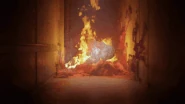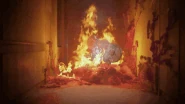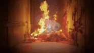A last scene appears showing a hallway blocked by the same substance, which extends across both walls of the hallway, is more voluminous, and is on fire. In this substance, there is a Poppy Playtime's cardboard cutout, and as the camera approaches it, screams can be heard and the cardboard cutout can be seen burning.