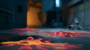 The next scene shows what appears to be an operating room, containing a low rolling chair and a long hospital bed, as well as a poster of Bron and two gloves similar to the hands of Huggy Wuggy and Kissy Missy, one on the floor and the other on top of the bed. Another scene shows another room, with a close-up of an unknown sticky substance on the floor similar to poppy gel with several moving bubbles, as well as The Prototype's legs walking down the hallway that appear in the doorway at the back of the room.