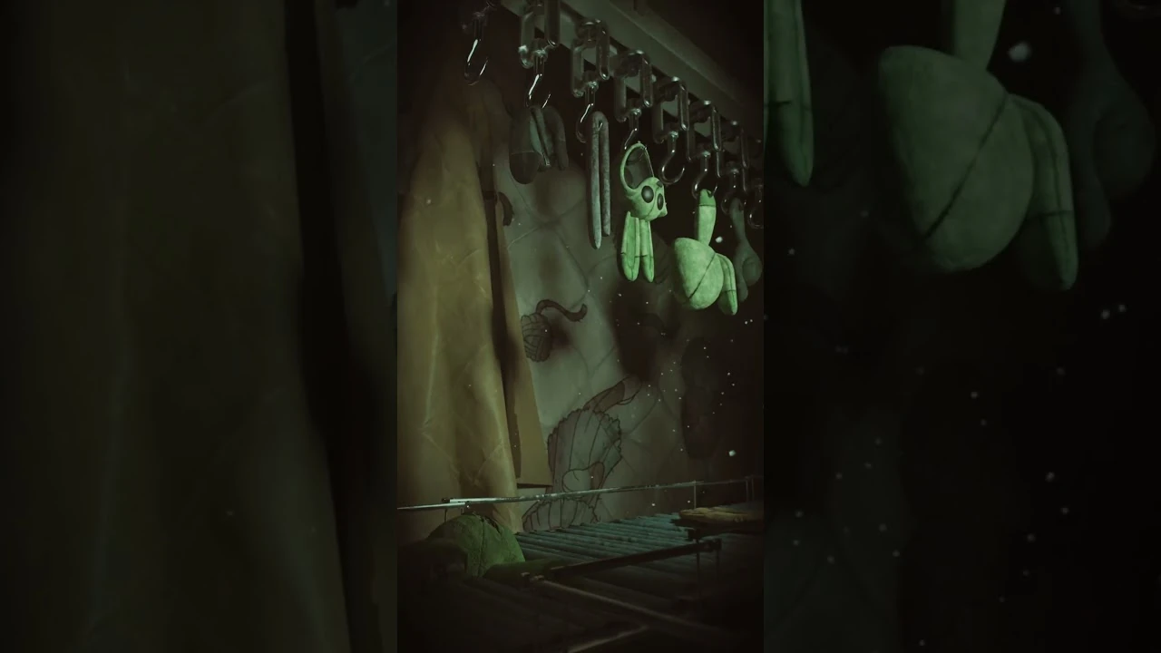 The trailer begins with a close-up shot of the head of a Hoppy Hopscotch plush toy, and as the camera zooms out, it is revealed that it is hanging on a butcher hook, along with other parts of the toy hanging on other hooks, as well as two yellow gloves and a mattress in the background with symbols of wool and Yarnaby, and a conveyor belt. Then, an unknown creature represented as a shadow appears, running towards some part of the room and is then electrocuted and screams, falling down as a result.