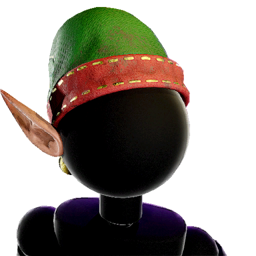 A hat advertised alongside the Elf Outfit, featuring a green elf hat, with cherry red edges and realistic, pointy ears. |