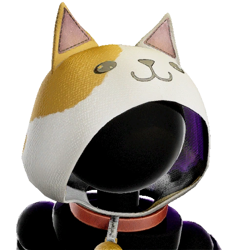 A hat advertised alongside the Cat Outfit, featuring a hood resembling a cute cat, with the hood consisting of a base color of white and a large tan spot. Two, pointy ears stand atop the hat, alongside two black eyes, a nose, and a smiling mouth. |