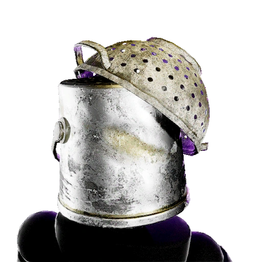 A hat advertised alongside the Scrap Metal Outfit, featuring a helmet completely with dirty bits and scraps. These bits and scraps specifically contain a metal bucket and a colander. |