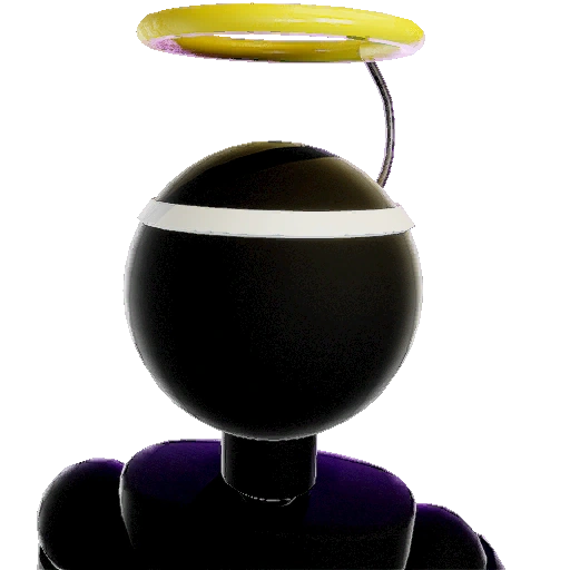 A hat attached to the back of the head, which holds a yellow halo above the head. |