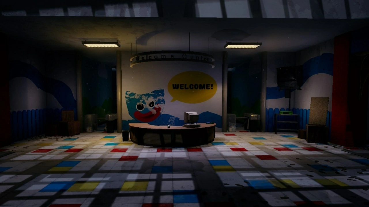 The Entrance appears as a typical entrance to any high-class company factory. A reception desk is seen right in front, with a Huggy mural welcoming guests. On the reception desk is the Leith Pierre Closing closing tape for the Green VCR seen to the right of the room connected to a TV mounted high on the wall. The room behind the reception desk is locked by a GrabPack-exclusive door. Additionally, to the left of the Main Entrance is the Security Room, while the Gift Shop can be seen on the right.