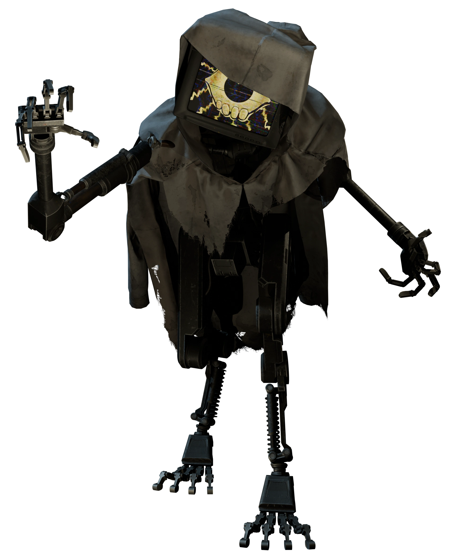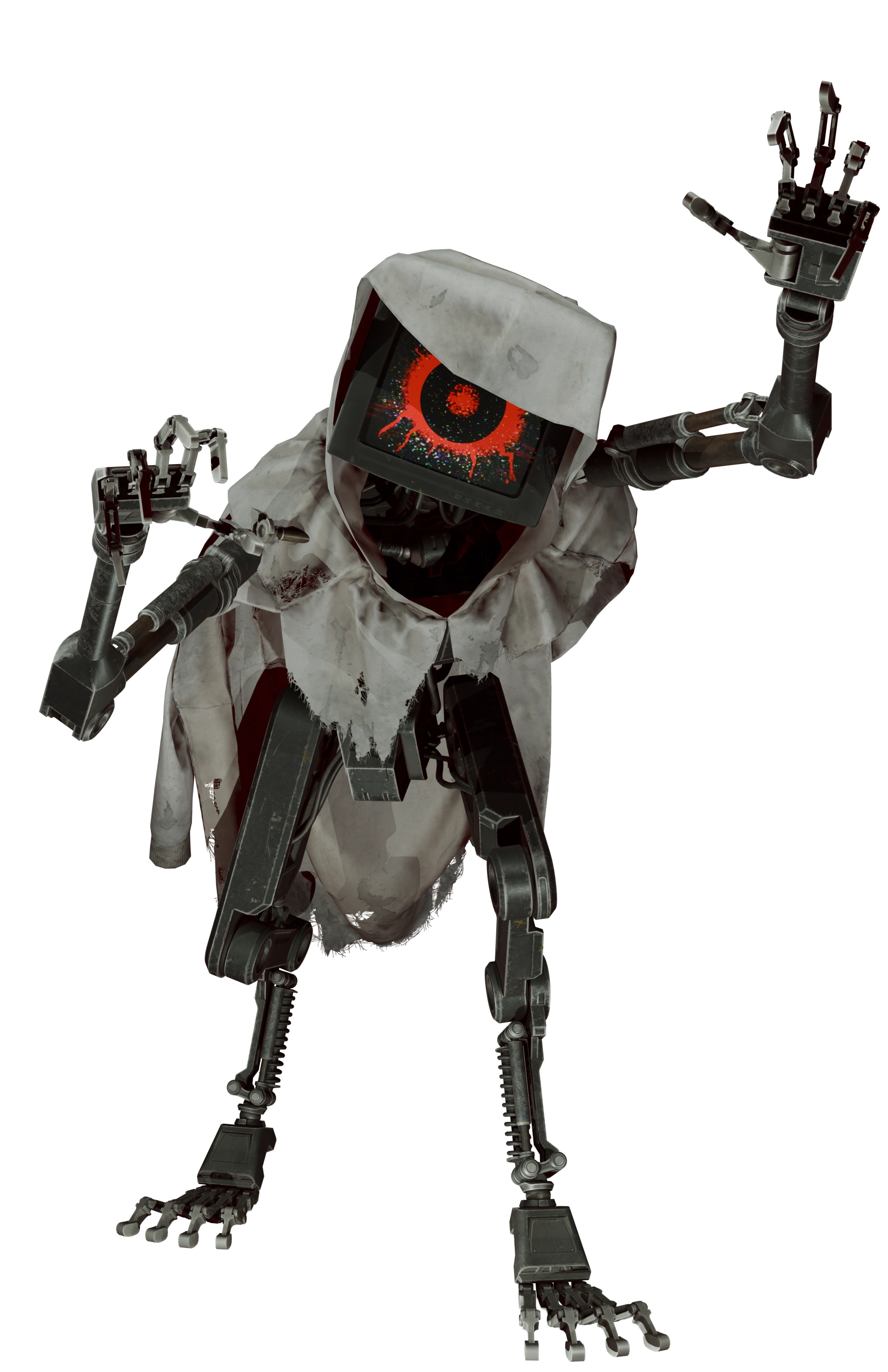 The Doctor's Bodies have a TV for a head, and long robotic arms and digitigrade legs. They wear torn lab coats stitched together, while others are seen inside full white cloaks. Certain bodies move using a system similar to how a marionette is controlled, being hooked up to that system by a wire. When the protagonist is spotted by them, a yellow eye surrounded by fingers and lighting bolt symbols appear on the screen before turning into a larger, chaotic red eye.