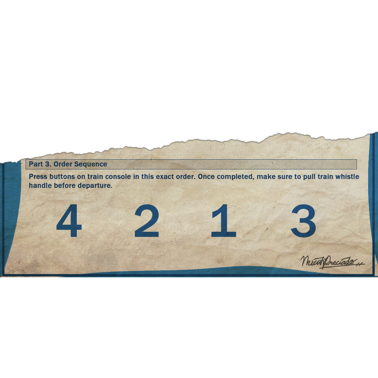 The third part of the code is a 4-number sequence, for example: 4213. This is the order of which the symbols need to be pressed. This piece is randomized per playthrough, meaning it isn't always the same code. If The Player follows the code correctly, the buttons will turn green, and they can power on the train.