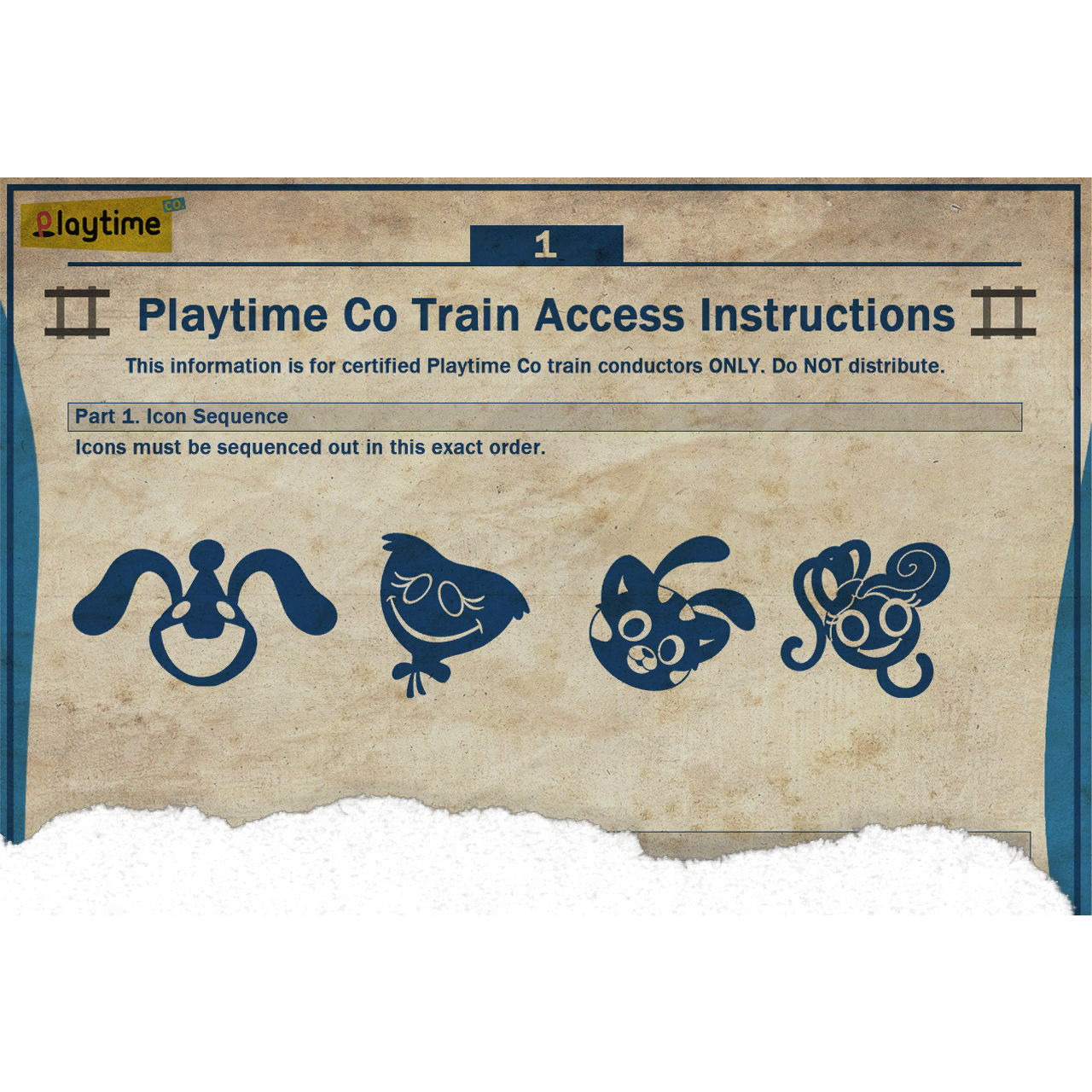The Train Code is a piece of paper that is ripped into 3 pieces. The first piece of the train code has four symbols: Bunzo Bunny, Kissy Missy, Cat-Bee, and Mommy Long Legs. The symbols need to appear in this order, but not be pressed in this order yet. The Player may need to hit the redo button on the panel in the Train that will shuffle the order of the symbols.